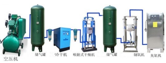 本系統(tǒng)配套產(chǎn)量500g/h的臭氧發(fā)生器1臺,采用氧氣源,外置無油空壓機、吸附干燥機、冷干機、精密過濾器、儲氣罐、制氧機、氧氣儲氣罐等組成。